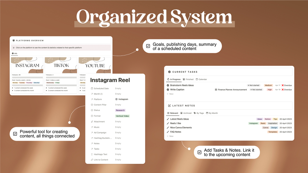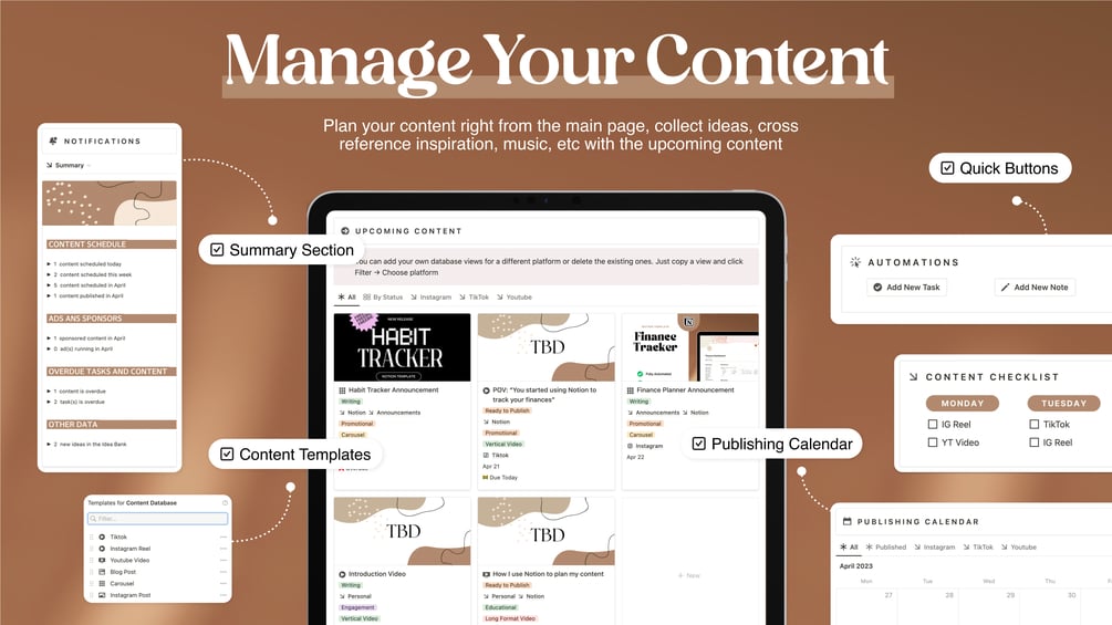 Creating content is a lot of work, and managing this content for all the different platforms at the same time is even harder and requires a good bullet-proof system. That’s why I’ve built this comprehensive Notion Template for Content Planning, so you can leave organizational questions behind and focus on the creative process. This is not just a publishing calendar or the place to keep your notes & ideas - it is a holistic system that lets you organize and connect all the pieces together, and on top of that it’s aesthetic and fully customizable - take the parts you need and throw unnecessary ones away. It took me more than 150+ hours to build this system so you won’t need to waste this time - just duplicate this template into your Notion and start planning content right away.