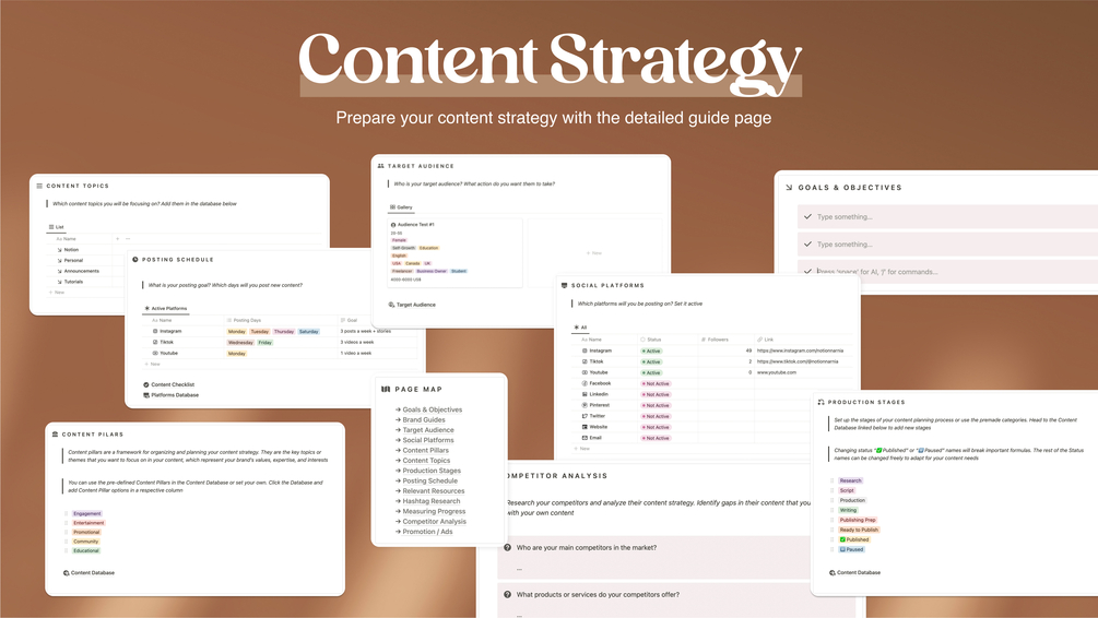 - Content Strategy (Page that will help you set up all the pieces of your content strategy - content pillars, target audience, goals&obsjectives, topics, production stages, schedule, etc)