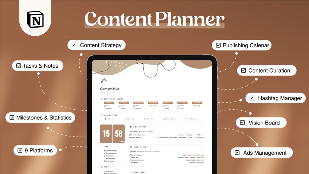 Content Hub Dashboard (Manage all your content-related tasks, notes, and ideas. Organize a publishing calendar, see an overview of the platforms you use, access resources, and more)