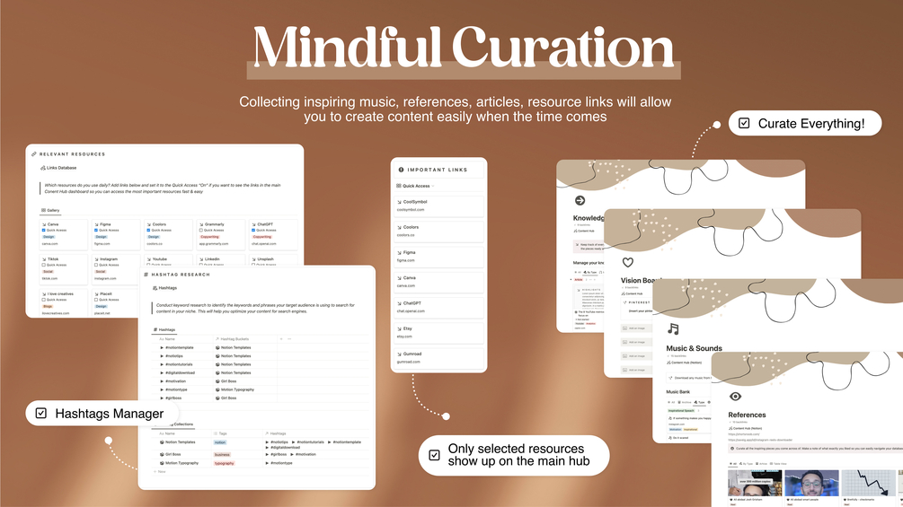 - Hashtags & Hashtag Collections (Curate and organize your hashtags into collections. You can link upcoming content with multiple hashtag collections, which will automatically generate a text field from which you can copy & paste into social media posts at the publishing stage)