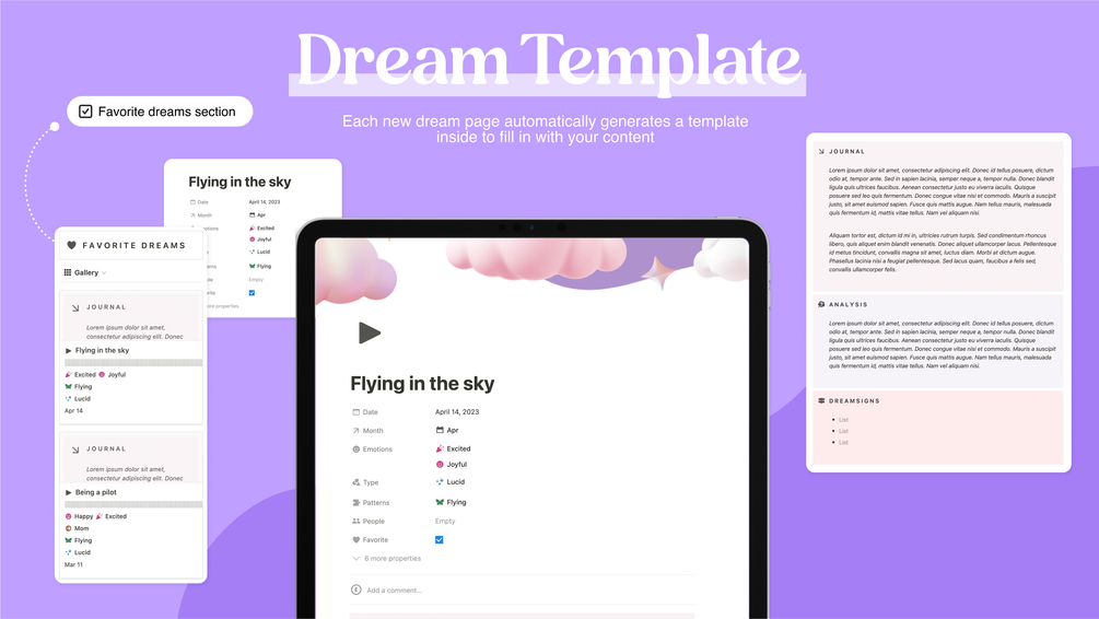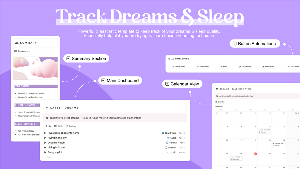 Whether you want to learn the Lucid Dreaming technique or just want to record your dreams from time to time this template is a perfect match. Make your dream tracking a pleasant experience & stick to the habit.