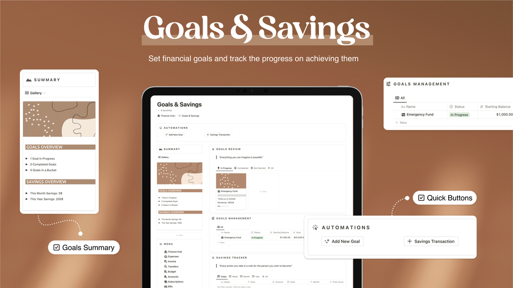 - Goals&Savings Tracker (Set up your goals and track transactions toward the goals)