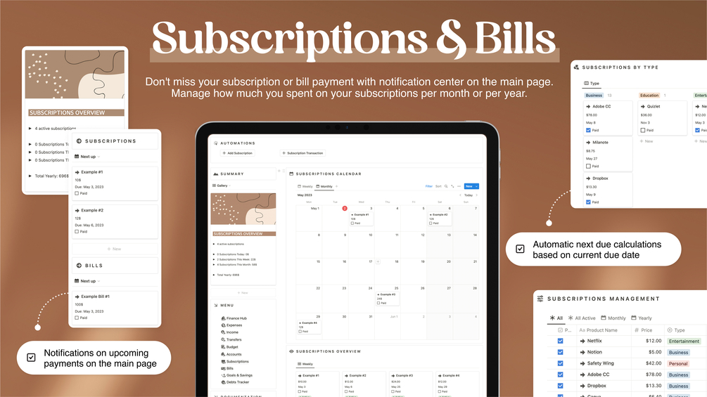 - Subscriptions (Track your subscriptions, calendar view, main dashboard notifications)