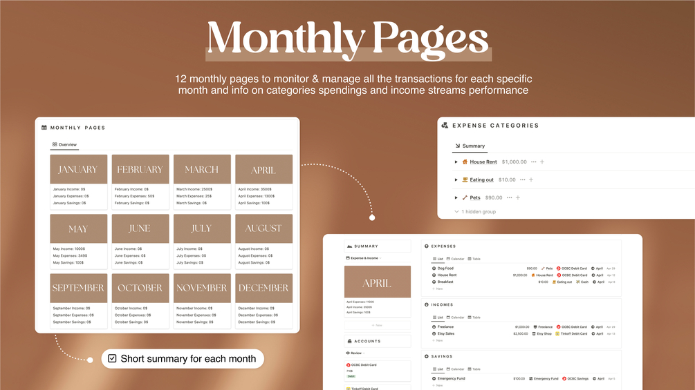 - Monthly Pages (12 monthly pages premade to see/manage all the transactions for each specific month + info on categories spendings income streams performance)