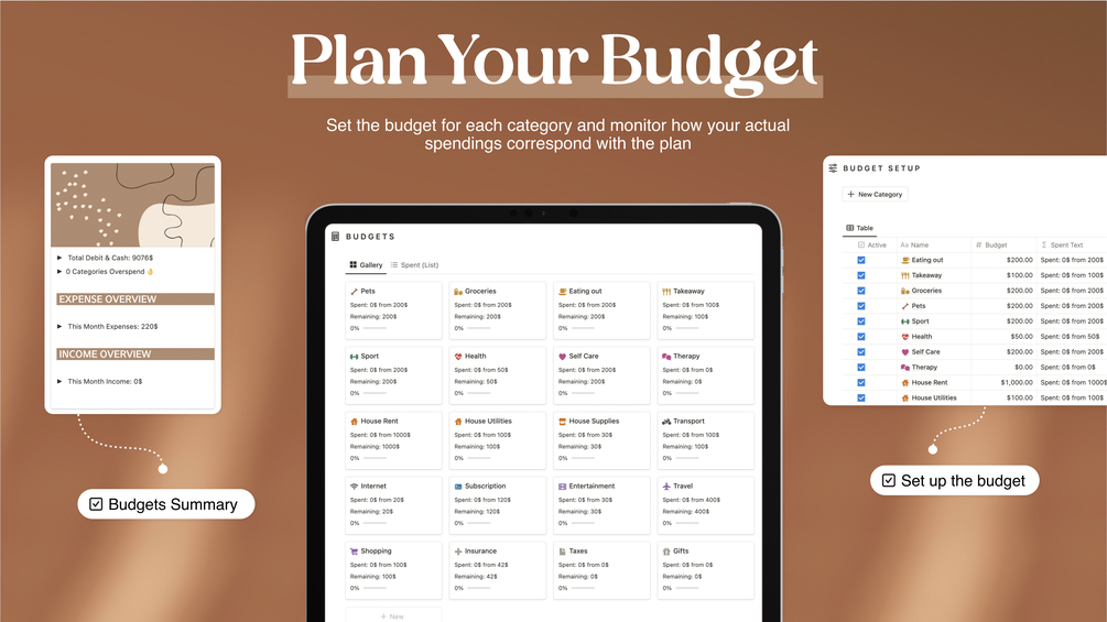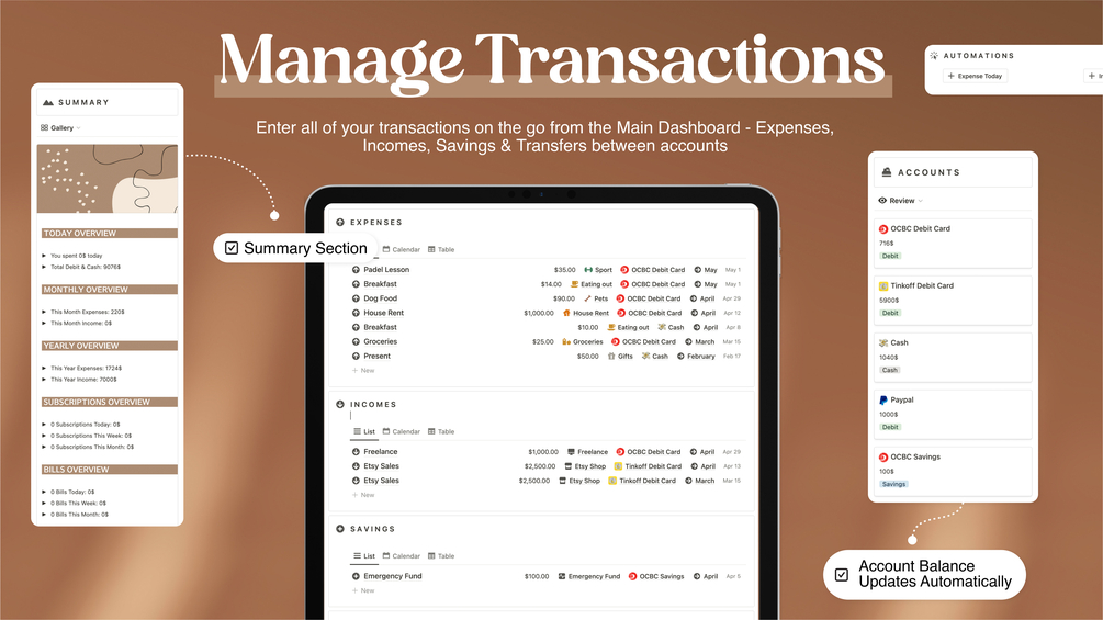 This Finance Dashboard is a powerful tool to track your expenses, income, money transfers, savings, and debts. Never lose track of where your money goes, set monthly budget goals, track your subscriptions, and more. You don’t have to use ugly spreadsheet files anymore, track your finances in an aesthetic Notion Template. You can access your finance dashboard from any of your devices, and it will sync automatically.
